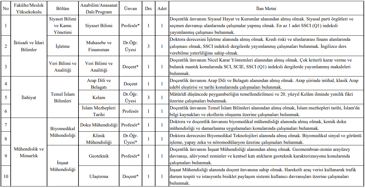 İlana göre öğretim üyesi alımı yapılacak unvanlar şöyle: