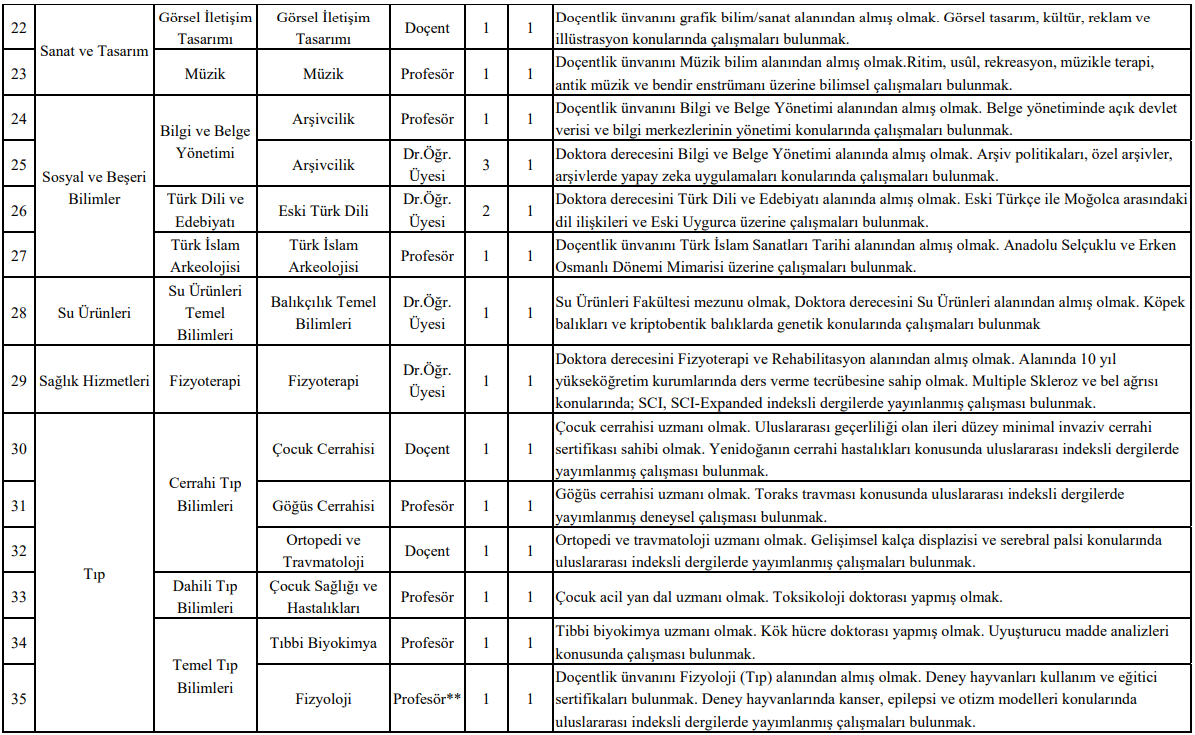 İlan kapsamında; profesör, doçent ve doktor öğretim üyesi unvanlarında toplam 35 farklı akademik kadro için başvuru alınacak. Kadrolar; sosyal bilimlerden mühendisliğe, sağlık bilimlerinden sanat ve tasarıma, ilahiyattan temel tıp bilimlerine kadar geniş bir yelpazeye yayılıyor.
