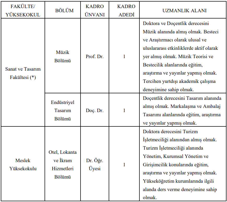 Endüstriyel Tasarım Bölümü için 1 Doçent Doktor alınacak. Adaylardan tasarım alanında doçentlik unvanına sahip olmaları, özellikle markalaşma ve ambalaj tasarımı alanlarında eğitim, araştırma ve yayın yapmış olmaları bekleniyor.