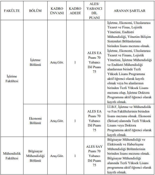 Üniversite ayrıca 2547 sayılı Kanun’un 50/d maddesi kapsamında araştırma görevlisi alımı da yapacak. Araştırma görevlisi kadroları için ilan edilen bölümler ve şartlar şu şekilde:
