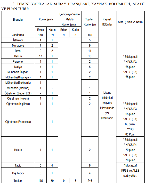 Jandarma Genel Komutanlığı tarafından yapılacak subay alımı kapsamında toplam 246 subay alınacak. Kontenjan dağılımına göre 169 kişi jandarma, 5 kişi istihkam, 9 kişi muhabere, 11 kişi ikmal, 18 kişi bakım, 2 kişi personel, 5 kişi maliye, 6 kişi mühendislik (inşaat, bilgisayar, elektronik, makine) ve 6 kişi öğretmen (beden eğitimi, hukuk, İngilizce, Fransızca) branşlarında istihdam edilecek. Ayrıca 2 hukuk, 9 tabip ve 4 diş tabibi alımı yapılacak. Toplamda 13 muvazzaf ve 233 sözleşmeli subay alımı gerçekleştirilecek.