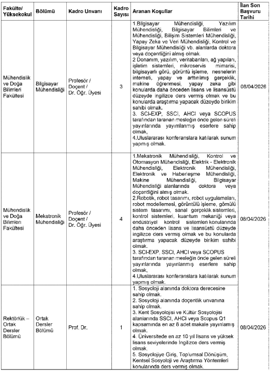 İlan kapsamında üniversitenin birçok fakültesinde farklı alanlarda öğretim üyesi alımı yapılacak. Özellikle mühendislik ve sosyal bilimler alanlarında yoğunlaşan kadrolar dikkat çekiyor.