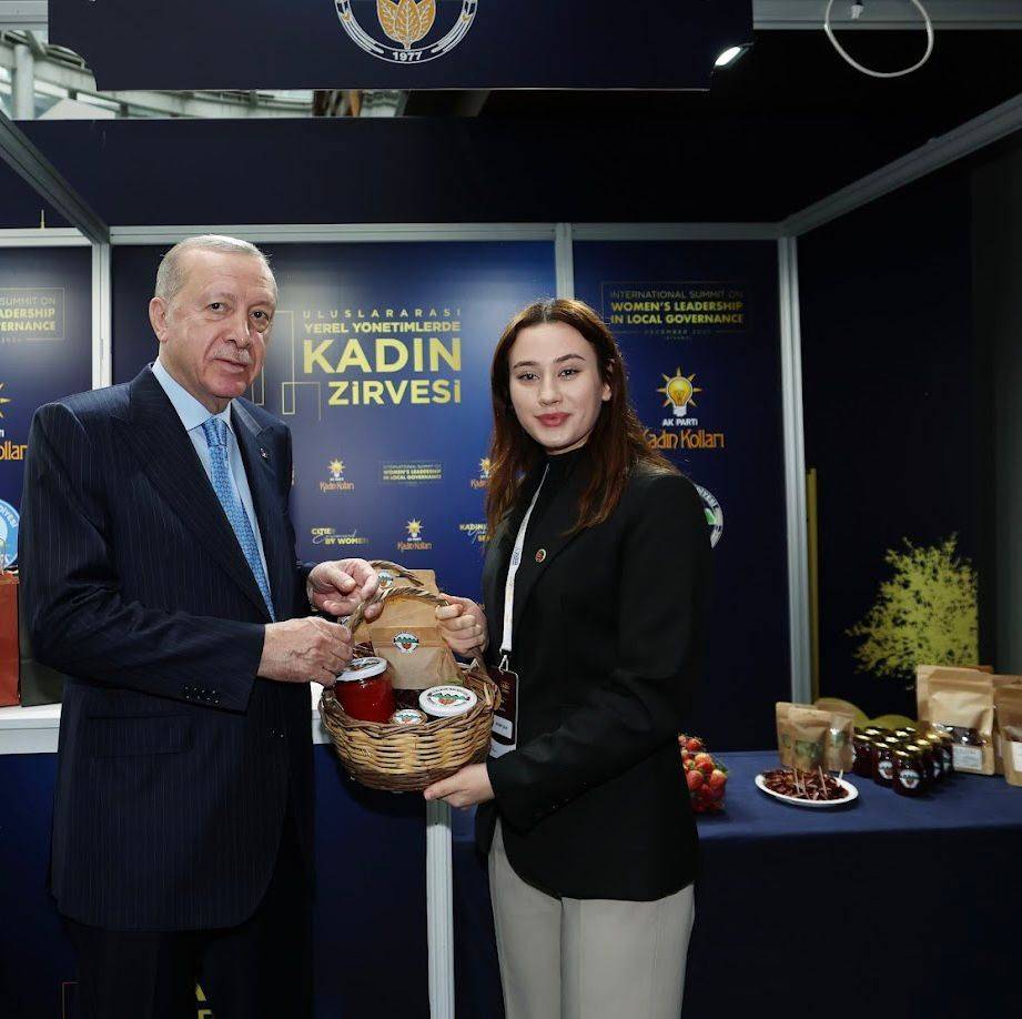 AK Parti’nin düzenlediği “Uluslararası Yerel Yönetimlerde Kadın Zirvesi”ne katılan Kalkım Belediye Başkanı Zeynep Çelik, beldeyi temsil ederek Cumhurbaşkanı Erdoğan’a yöresel ürünlerden oluşan hediye sepeti takdim etti.