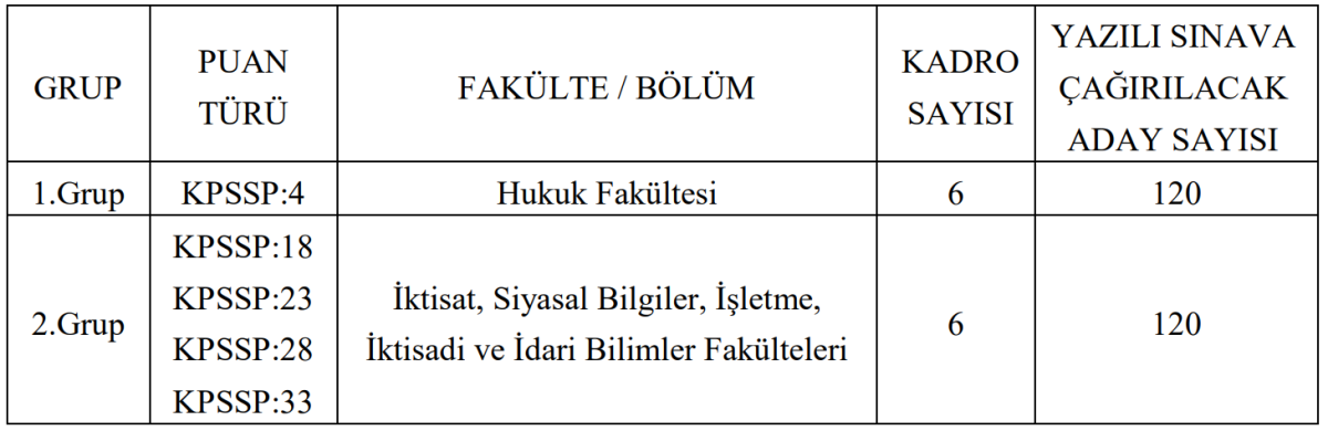 1. Grup: Hukuk Fakültesi mezunlarından 6 kişi alınacak. (KPSS P4 puanı ile)