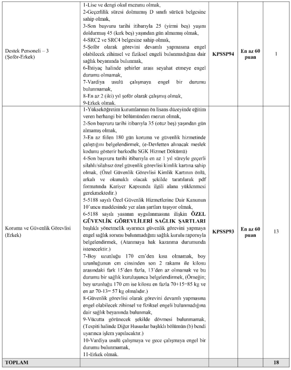 Yayımlanan ilana göre alım yapılacak kadrolar arasında Arşiv Uzmanı, Destek Personeli, Şoför ve Koruma ve Güvenlik Görevlisi gibi farklı pozisyonlar yer alıyor. Toplam 18 kişilik kontenjanın dağılımı ise şu şekilde açıklandı: