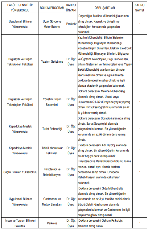Üniversitenin farklı birimlerinde toplam 9 öğretim üyesi alımı yapılacak. Kadrolar ve özel şartlar şu şekilde sıralanıyor: