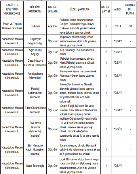 Kapadokya Üniversitesi, akademik kadrosunu güçlendirmek amacıyla profesör, doktor öğretim üyesi, araştırma görevlisi ve öğretim görevlisi kadrolarında yeni alımlar yapacağını duyurdu. Üniversitenin çeşitli fakülte ve yüksekokullarında istihdam edilmek üzere yayımlanan ilanda başvuru koşulları, özel şartlar ve gerekli belgeler tüm detaylarıyla açıklandı. Başvurular, belirtilen süreler içinde şahsen veya posta yoluyla yapılacak olup e-posta ile gönderilen dosyalar kabul edilmeyecek.