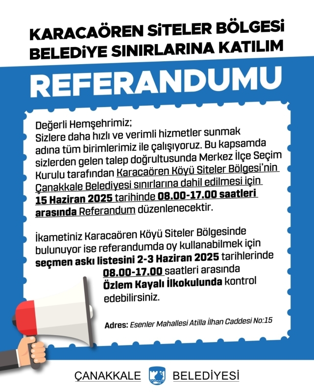 Referandumda oy kullanabilmek için, ikamet adresi Karacaören Köyü Siteler Bölgesi’nde olan vatandaşların, 2-3 Haziran 2025 tarihlerinde 08.00-17.00 saatleri arasında Özlem Kayalı İlkokulu’nda askıya çıkan seçmen listelerini kontrol etmeleri gerekiyor.