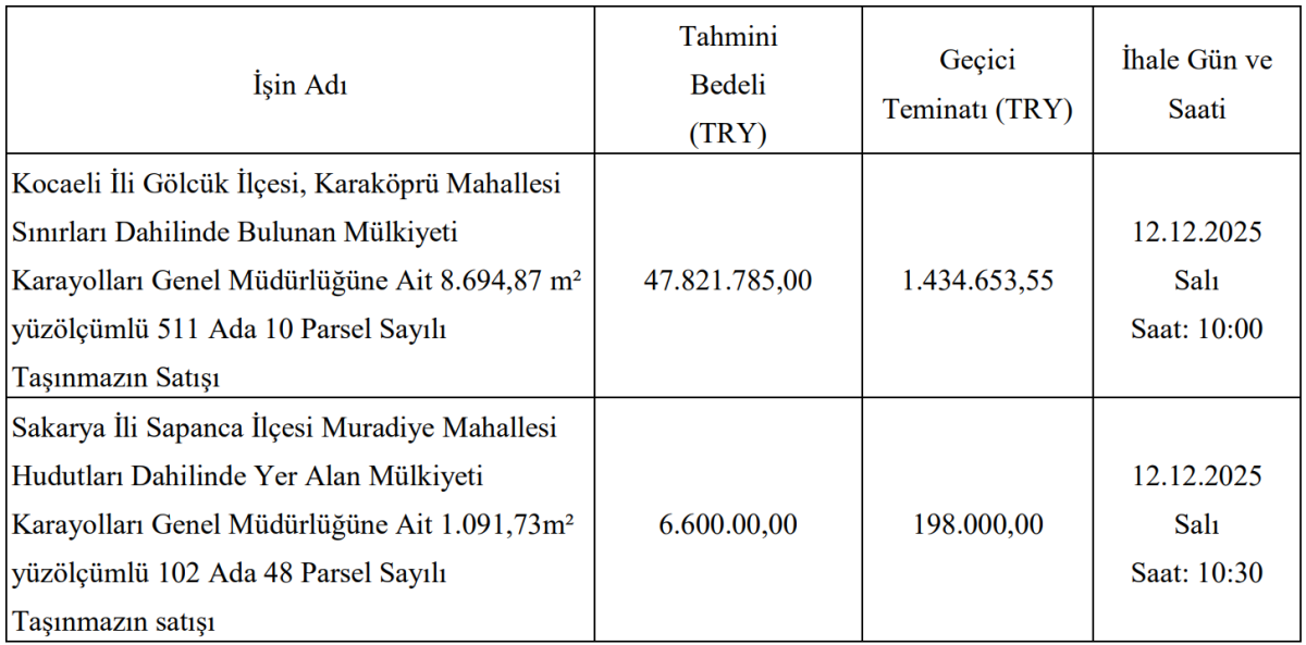 Ulaştırma ve Altyapı Bakanlığı Karayolları Genel Müdürlüğü 1. Bölge Müdürlüğü, Kocaeli ve Sakarya’daki taşınmazlarını satışa çıkardı. 2886 sayılı Devlet İhale Kanunu’nun 35/a maddesi uyarınca gerçekleştirilecek olan ihale, kapalı teklif usulü artırma yöntemiyle Karayolları 1. Bölge Müdürlüğü İhale Salonunda yapılacak.