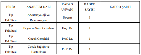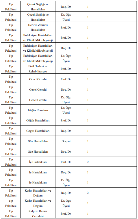 Profesör kadrolarında Çocuk Cerrahisi, Çocuk Sağlığı ve Hastalıkları, Deri ve Zührevi Hastalıkları, Enfeksiyon Hastalıkları ve Klinik Mikrobiyoloji, Fizik Tedavi ve Rehabilitasyon, Genel Cerrahi, Göğüs Hastalıkları, İç Hastalıkları, Kalp ve Damar Cerrahisi, Kardiyoloji, Kulak Burun Boğaz, Plastik ve Rekonstrüktif Cerrahi, Radyodiagnostik, Ruh Sağlığı ve Hastalıkları, Tıbbi Biyokimya, Tıbbi Patoloji ve Üroloji alanları öne çıkıyor. Bazı anabilim dallarında birden fazla profesör kadrosu ilan edilmiş olması dikkat çekiyor.