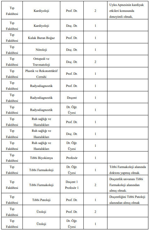 Bazı kadrolar için özel nitelikler aranıyor. Kardiyoloji profesör kadrosu için “Uyku apnesinin kardiyak etkileri konusunda deneyimli olmak” şartı dikkat çekiyor. Tıbbi Farmakoloji alanında ise doktora yapmış olmak veya doçentlik unvanını ilgili alandan almış olmak gibi akademik uzmanlığa dayalı koşullar yer alıyor. Tıbbi Patoloji profesör kadrosu için de doçentliğin bu alandan alınmış olması şartı bulunuyor.