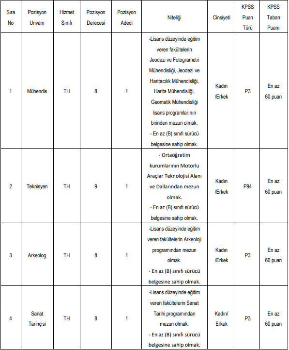 Özellikle mühendis kadrosu için jeodezi, harita ve geomatik alanlarından mezun olma şartı aranırken, teknisyen kadrosunda motorlu araçlar teknolojisi mezuniyeti gerekiyor. Arkeolog ve sanat tarihçisi kadrolarında ise ilgili lisans programlarından mezuniyet şartı bulunuyor.