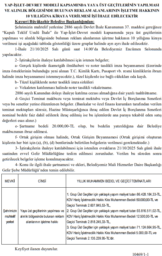 Kayseri Büyükşehir Belediyesi, kent genelinde yaya üst geçitlerini Yap-İşlet-Devret (YİD) modeliyle yaptırıp, alınlık bölgelerindeki reklam alanlarının işletme haklarını 10 yıllığına kiraya verecek. Belediyenin yayımladığı duyuruya göre ihale, 21/10/2025 Salı günü saat 14.00’te kapalı teklif usulüyle Encümen Salonunda gerçekleşecek.