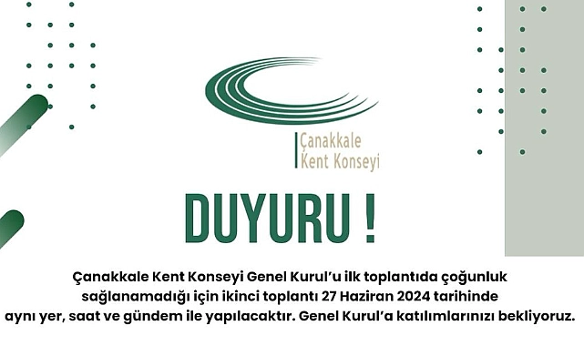 İlk toplantıda yeterli çoğunluğun sağlanamaması nedeniyle ertelenen Çanakkale Kent Konseyi Genel Kurulu, 27 Haziran 2024 tarihinde yeniden toplanacak. Toplantı, saat 16:00’da Ercan Adsız Toplantı Salonu’nda gerçekleşecek olup gündem maddeleri aşağıdaki gibidir;