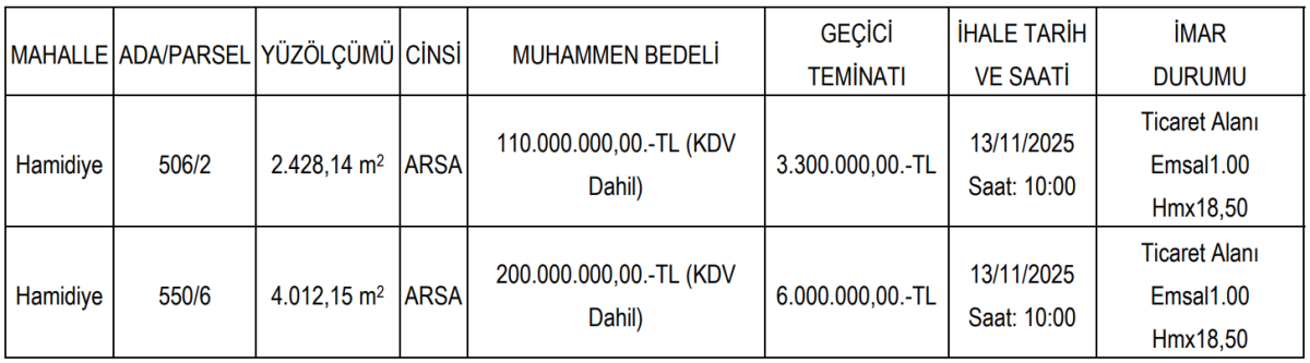 İhale duyurusuna göre satışa sunulacak taşınmazlar Hamidiye Mahallesi sınırlarında yer alıyor.