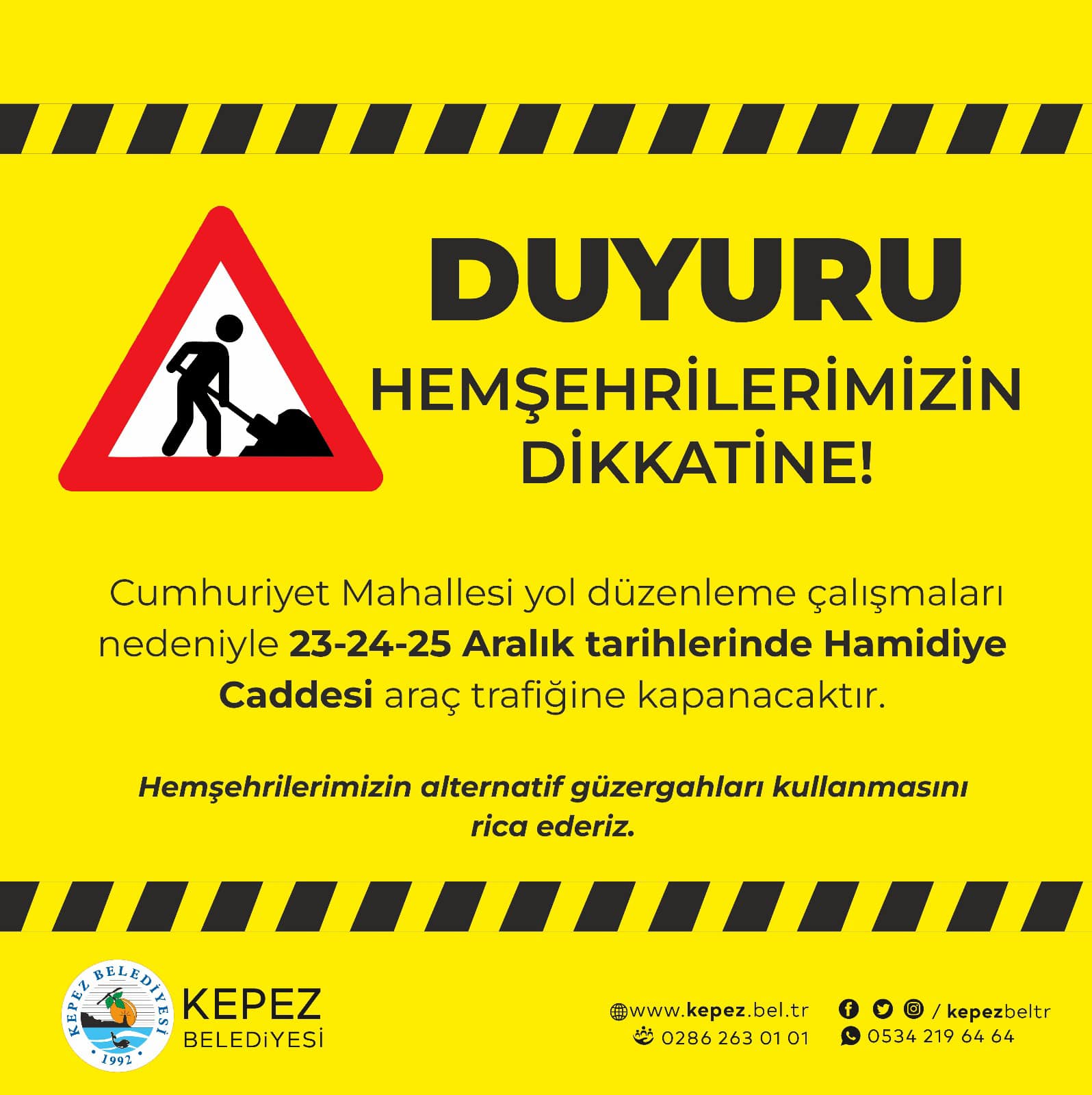 Kepez Belediyesi tarafından yapılan duyuruda, “Cumhuriyet Mahallesi yol düzenleme çalışmaları nedeniyle 23,24,25 Aralık tarihlerinde Hamidiye Caddesi araç trafiğine kapanacaktır. Hemşerilerimizin alternatif güzergahları kullanmasını rica ederiz” ifadeleri yer aldı.