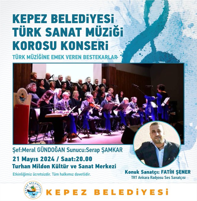 Kepez Belediyesi'nin sosyal medya hesaplarından yapılan duyuruya göre, Türk Sanat Müziği Korosu'nun performansıyla unutulmaz bir müzik ziyafeti sunması bekleniyor.
