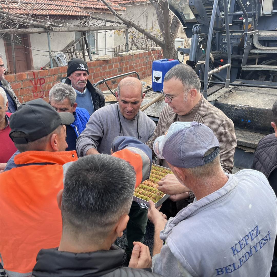 Asfalt serim çalışmalarını yerinde inceleyen Kepez Belediye Başkanı Birol Arslan, işçilere baklava sürprizi yaptı.