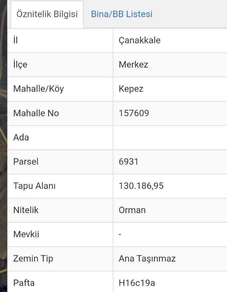 Çanakkale Orman Bölge Müdürlüğü İnşaat alanı 130 dönüm. Okla gösterilmiş olan kısımda bulunan sosyal donatı alanlarının orman tapusu içinde kaldığı açıkca görülüyor.