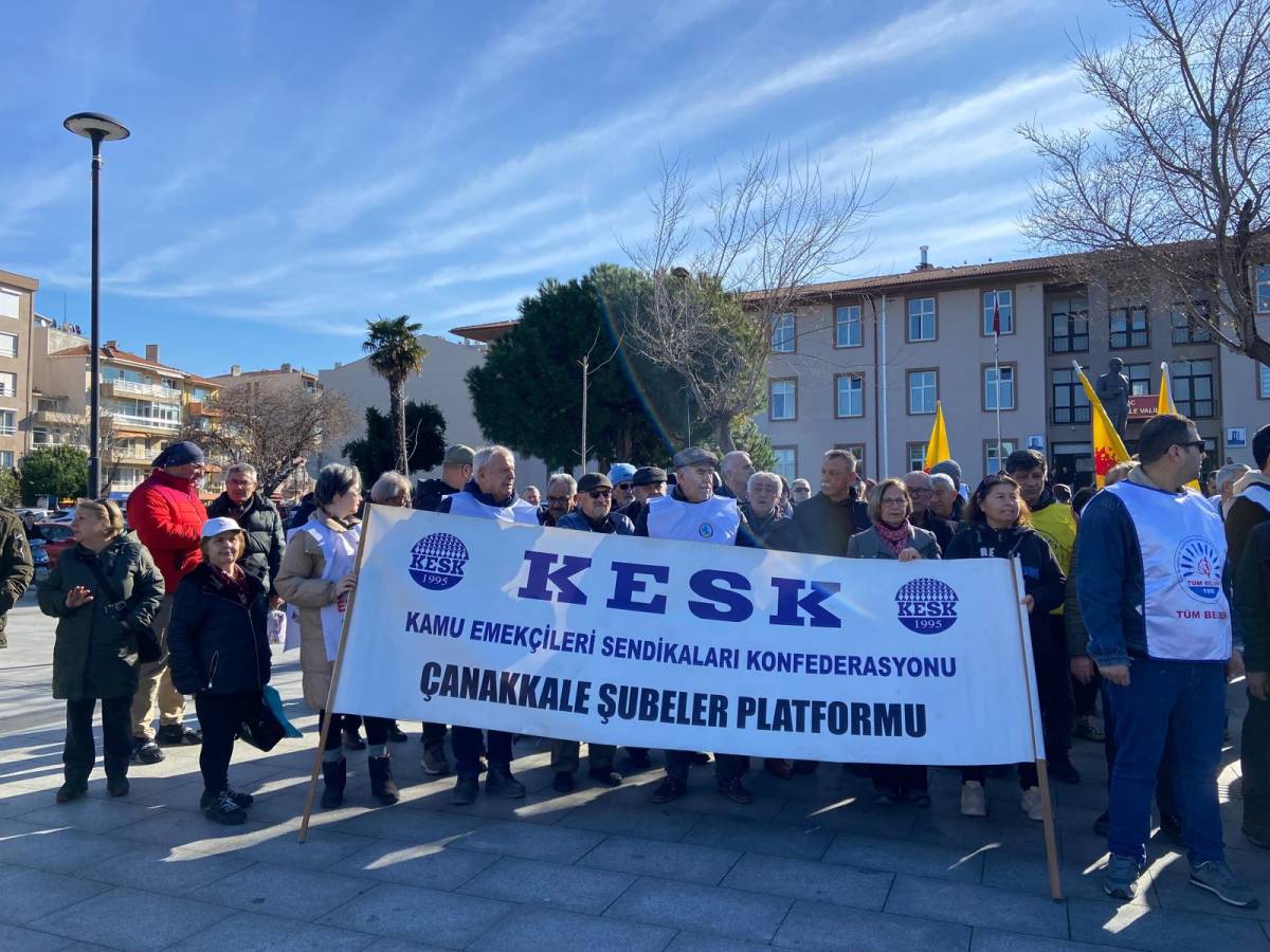 Kamu Emekçileri Sendikaları Konfederasyonu (KESK) Çanakkale Şubeler Platformu, ülke genelinde gerçekleştirilen iş bırakma eylemi kapsamında bugün sokağa çıktı. Çanakkale Valiliği önünde toplanan çok sayıda kamu çalışanı, artan hayat pahalılığına, düşük maaş zamlarına ve vergi adaletsizliğine karşı tepkilerini dile getirdi.