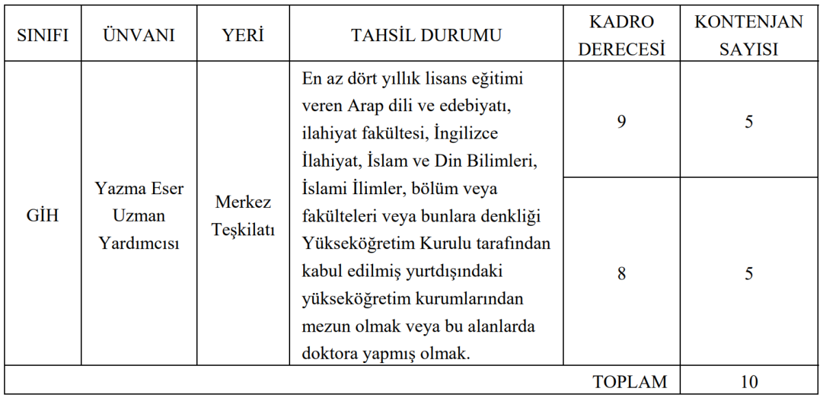 İlana göre alımlar, Genel İdare Hizmetleri (GİH) sınıfında yer alan Yazma Eser Uzman Yardımcısı unvanı için gerçekleştirilecek. Görev yeri Türkiye Yazma Eserler Kurumu Başkanlığı Merkez Teşkilatı olarak belirlendi. Toplamda 10 kişilik kadro için alım yapılacak.