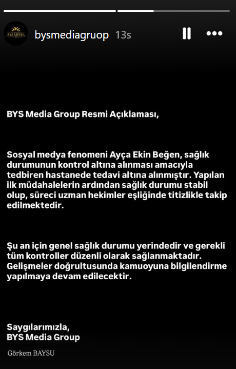 Hastaneye kaldırılan Ayça Ekin Beğen’in sağlık durumuyla ilgili beklenen açıklama ise menajerlik ajansından geldi. Bys Media Group tarafından yapılan resmi açıklamada, kamuoyunun doğru bilgilendirilmesi adına şu ifadelere yer verildi: "Sosyal medya dünyasının sevilen isimlerinden Ayça Ekin Beğen, şu an hastanede tedavi altında olup, gerekli tüm tıbbi müdahaleler uzman ekipler tarafından titizlikle sürdürülmektedir. Genel sağlık durumu kontrol altına alınmış olup, sürecin olumlu yönde ilerlediğini belirtmek isteriz."