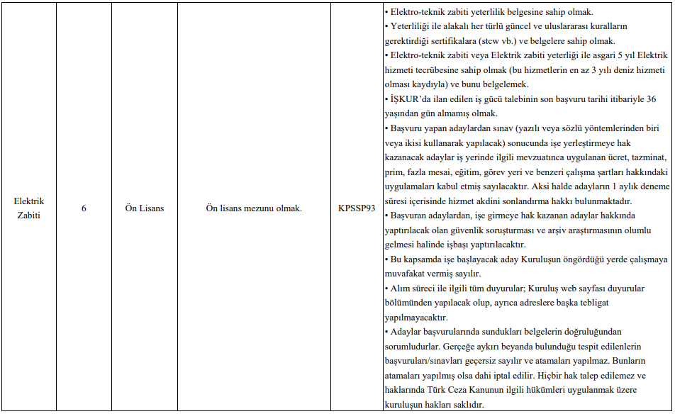Elektrik zabiti kadrosunda ise en az 5 yıl tecrübe şartı aranırken, bu sürenin en az 3 yılının denizde geçmiş olması zorunlu tutuluyor.