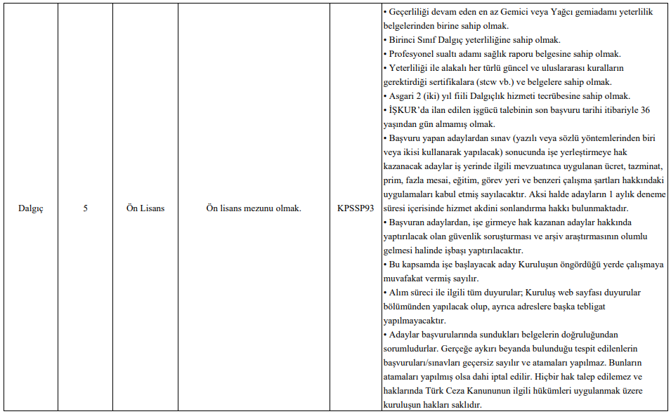 Dalgıç kadrosunda ise 1. sınıf dalgıç belgesi ve en az 2 yıl aktif deneyim gibi kriterler bulunuyor.