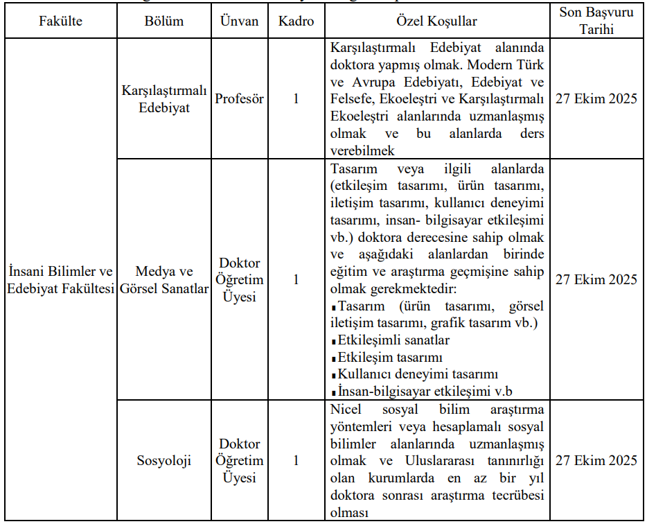 Başvuru yapacak adayların Karşılaştırmalı Edebiyat alanında doktora yapmış olmaları, Modern Türk ve Avrupa Edebiyatı, Edebiyat ve Felsefe, Ekoeleştiri ve Karşılaştırmalı Ekoeleştiri alanlarında uzmanlaşmış olmaları gerekiyor. Ayrıca bu alanlarda ders verebilecek akademik yetkinliğe sahip olmaları bekleniyor.