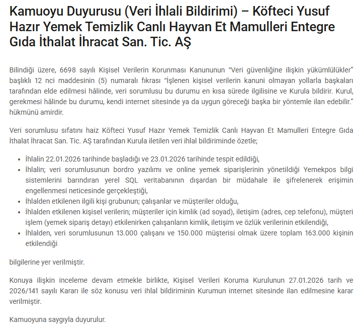 Köfteci Yusuf Hazır Yemek Temizlik Canlı Hayvan Et Mamulleri Entegre Gıda İthalat İhracat San. Tic. AŞ hakkında bildirilen veri ihlaline ilişkin inceleme sürecinin sürdüğü bildirildi. Kurum tarafından yapılacak değerlendirmeler sonucunda, ihlalin kapsamı ve alınan tedbirler doğrultusunda gerekli işlemlerin yürütüleceği ifade edildi. Veri ihlali bildirimi, Kurulun resmi internet sitesinde kamuoyunun erişimine açık şekilde yayımlandı.