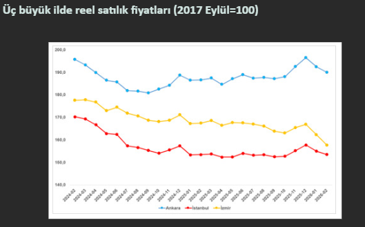 Yıllık reel fiyat değişimlerine bakıldığında ise bölgesel farklılıklar dikkat çekiyor. İstanbul’da fiyatlar yıllık bazda %0 değişimle yatay bir seyir izlerken, İzmir’de %5,9 oranında ciddi bir reel düşüş yaşandı. Ankara ise bu iki şehirden ayrışarak yıllık bazda %1,8 oranında sınırlı bir reel artış kaydetti.