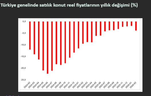 İstatistiksel verilere göre, Şubat 2026’da Türkiye genelindeki reel konut fiyat endeksi bir önceki aya kıyasla %2,1 oranında bir düşüş gösterdi. Bu gerileme, 2026 yılının başından itibaren izlenen aşağı yönlü trendin istikrarlı bir şekilde devam ettiğini kanıtlıyor. Yıllık bazda bakıldığında ise durum daha net bir tablo sunuyor; Türkiye genelinde satılık konutların reel fiyatlarındaki yıllık değişim oranı, bir önceki aya göre 1,9 puan daha azalarak %3,9 düşüş olarak kayıtlara geçti.
