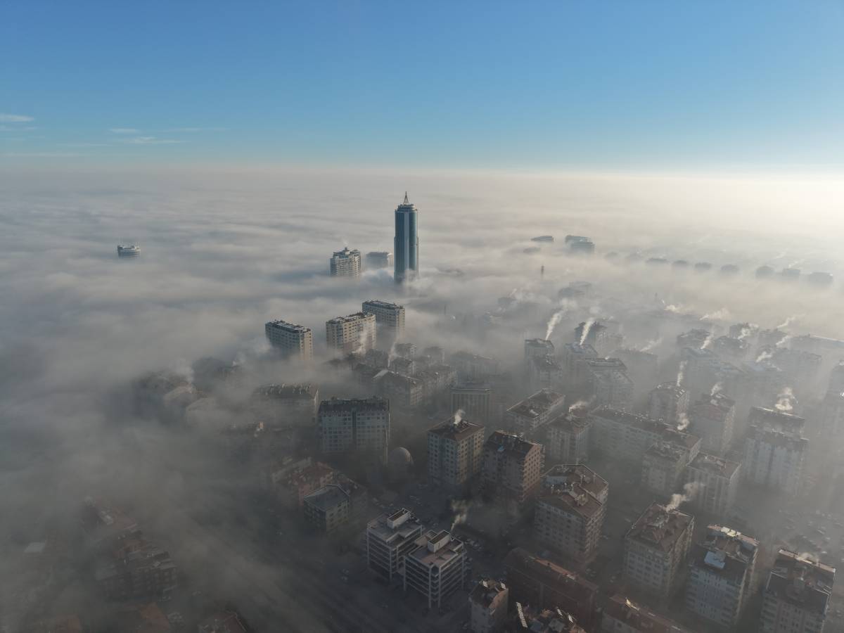 Konya’nın simge noktaları da sisin etkisiyle adeta kayboldu. Şehir merkezinde bulunan yüksek yapılar, iş merkezleri ve apartmanlar sis tabakası arasında siluet halinde görüldü. Kentin bazı bölgelerinde binaların üst katları tamamen sisin içinde kalırken, bu durum görsel olarak dikkat çekici manzaralar oluşturdu.