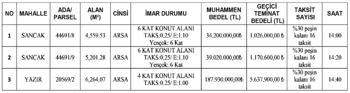 Satın alıcılar, peşinat bedelini tebliğ tarihinden itibaren 15 gün içinde ödeyecekler. Tapu harcı, gazete ilan ücreti, damga vergisi, sözleşme noter onay ücretleri ve kati teminat alıcıya ait olacak. İhale, üçüncü kişilere devredilemez ve KDV’den muaftır.