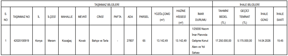 İhale ilanına göre satışa çıkarılan taşınmaz, Konya’nın Meram ilçesi Kozağaç Mahallesi Kovalı mevkiinde yer alıyor. Toplam yüzölçümü ise tam 13 bin 142 metrekare.