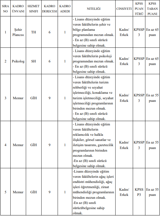 - Şehir Plancısı (1 kişi): Şehir ve bölge planlama mezunu, KPSS en az 65 puan