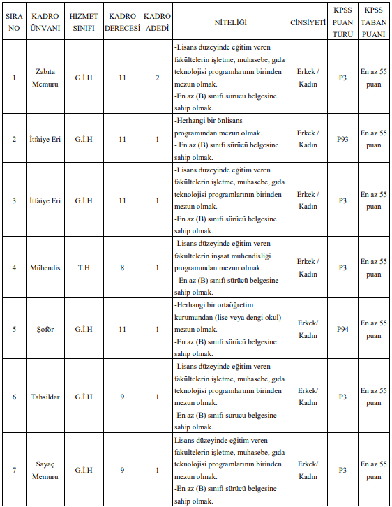 Zabıta memuru ve itfaiye eri kadroları için ayrıca: