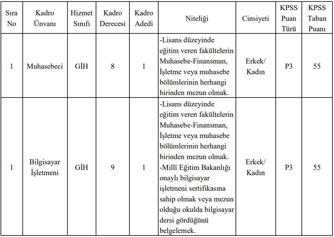 Muhasebeci kadrosu için adayların muhasebe, işletme veya finans bölümlerinden mezun olmaları gerekirken, bilgisayar işletmeni kadrosu için ek olarak MEB onaylı sertifika veya bilgisayar dersi alınmış olma şartı aranıyor.
