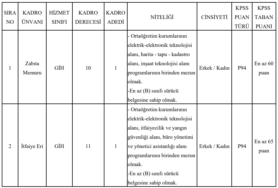 Belediye tarafından yayımlanan ilana göre bir zabıta memuru ve bir itfaiye eri kadrosu için personel alımı yapılacak.