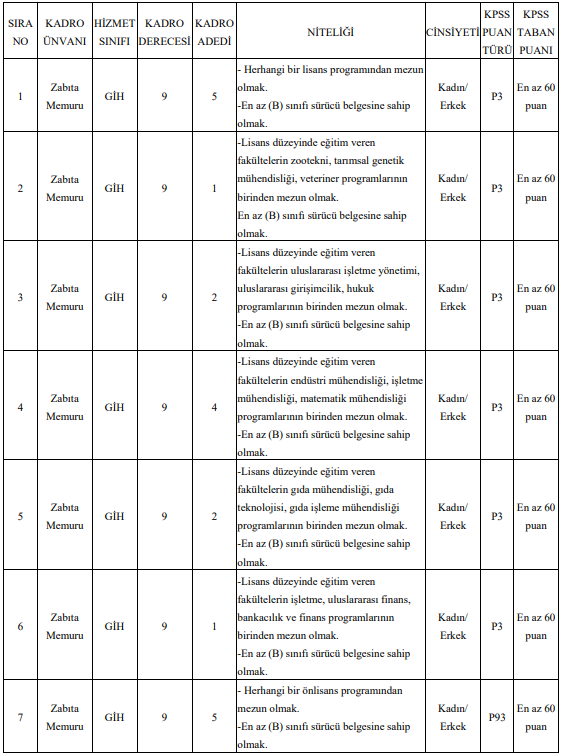 İlan kapsamında lisans ve önlisans mezunları için farklı kadrolar ayrılırken, adayların KPSS’den en az 60 puan almış olması gerekiyor. Kadrolar arasında genel lisans mezunlarının yanı sıra; zootekni, hukuk, mühendislik ve finans gibi bölümlerden mezun olan adaylara özel kontenjanlar da bulunuyor.