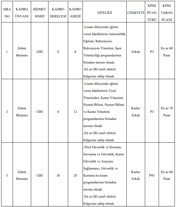 8 kadro için spor bilimleri alanlarından mezun erkek adaylar alınacak. 12 kadro için kamu yönetimi ve benzeri bölümlerden mezun kadın ve erkek adaylar başvurabilecek. 20 kadro ise ön lisans düzeyinde güvenlik ve koruma alanlarından mezun adaylara ayrıldı.