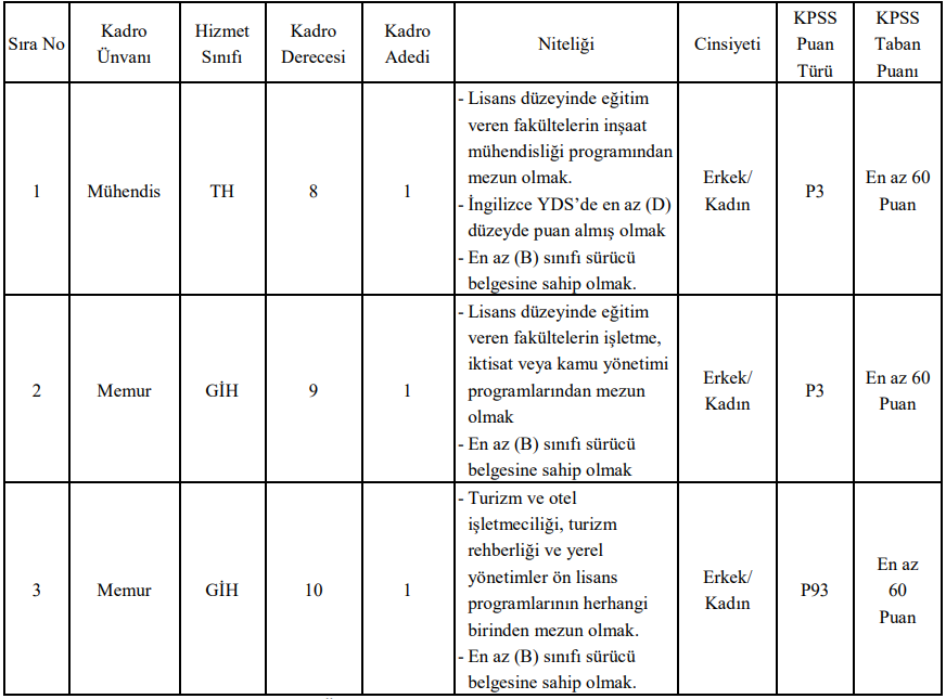 İlan kapsamında alım yapılacak kadrolar şöyle: