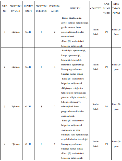 Eğitmen kadrosunda ise toplam 10 personel alınacak. Resim ve görsel sanatlar, fen bilgisi, kimya, biyoloji, matematik, bilgisayar ve öğretim teknolojileri ile astronomi ve uzay bilimleri gibi farklı alanlardan mezun adaylar başvuru yapabilecek.
