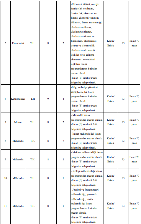 Mimarlık mezunları için 2, şehir ve bölge planlama mezunları için 1 kadro açıldı. Ekonomist pozisyonunda 2 kişi istihdam edilecek. Kütüphaneci kadrosu için 4, tekniker kadroları için ise 3 kişilik kontenjan ayrıldı.