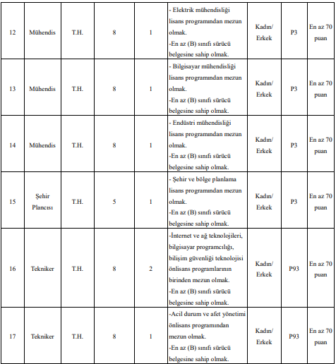 Lisans mezunu kadrolar için KPSS P3 puan türü esas alınacak. Tekniker kadrolarında ise ön lisans mezunları için KPSS P93 puan türü geçerli olacak. Tüm pozisyonlar için asgari KPSS taban puanı 70 olarak belirlendi.