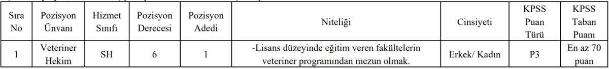 İlan edilen kadroya başvuracak adayların, lisans düzeyinde eğitim veren fakültelerin veterinerlik programından mezun olması şartı aranıyor.