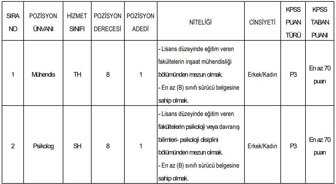 İlan kapsamında biri Mühendis, biri Psikolog olmak üzere toplam 2 sözleşmeli personel istihdam edilecek. Adayların belirlenen genel ve özel şartları taşıması ve KPSS puanı esas alınarak yapılacak sözlü sınavda başarılı olması gerekecek.
