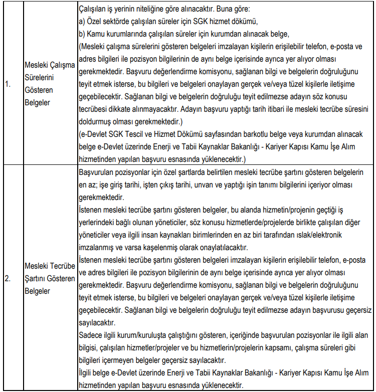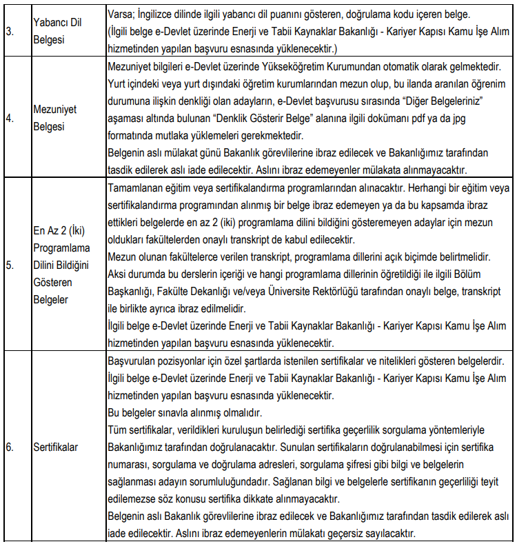 Adaylardan, başvuracakları pozisyonlara göre eğitim şartlarını karşılamaları, mesleki deneyimlerini belgelemeleri ve gerekli sertifikalara sahip olmaları istendi. Ayrıca, kamu kurumlarında arşiv araştırması ve güvenlik soruşturmasının tamamlanması gerektiği bildirildi.
