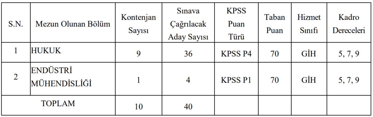 Toplam 10 kişilik kontenjan için sınava çağrılacak aday sayısı 40 olarak belirlendi. KPSS puanı en yüksek adaydan başlanarak sıralama yapılacak, kontenjanın dört katı kadar aday sözlü sınava davet edilecek. Son sıradaki aday ile aynı puana sahip olanlar da sınava çağrılacak.