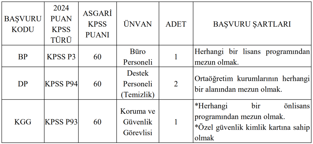 Personel alımı, 2024 KPSS (B) grubu puanlarına göre yapılacak. Adayların en az 60 KPSS puanına sahip olması şartı aranıyor. Pozisyonlara göre aranan KPSS puan türleri ise şu şekilde: